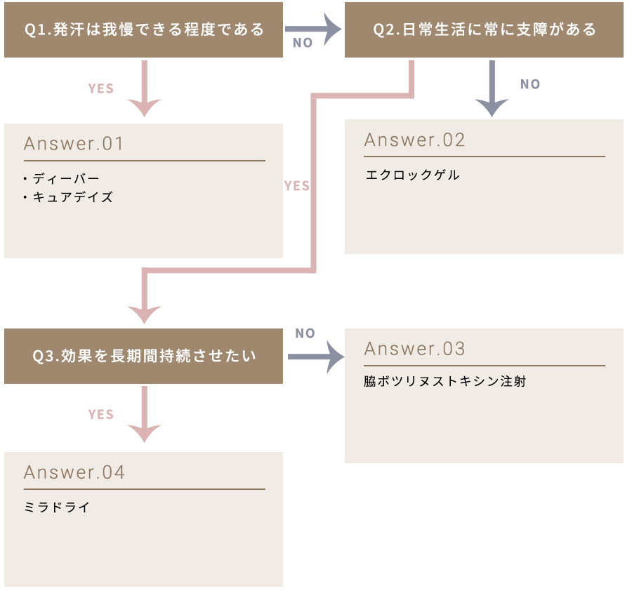 当クリニックでは根治的治療やボツリヌストキシン注射、外用薬など、患者様のご希望に合ったワキガ・ワキ多汗症治療に対応することができるため、クリニックの都合に合わせた偏った治療をお勧めするのではなく、患者様の状態に合わせてベストな治療をご提案します。